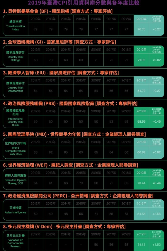 國際透明組織於今(2020)年1月23日公布2019年清廉印象指數(Corruption Perceptions Index,簡稱CPI),我國排名第28名,較2018年上升3名,為2012年新評比標準以來最佳成績。